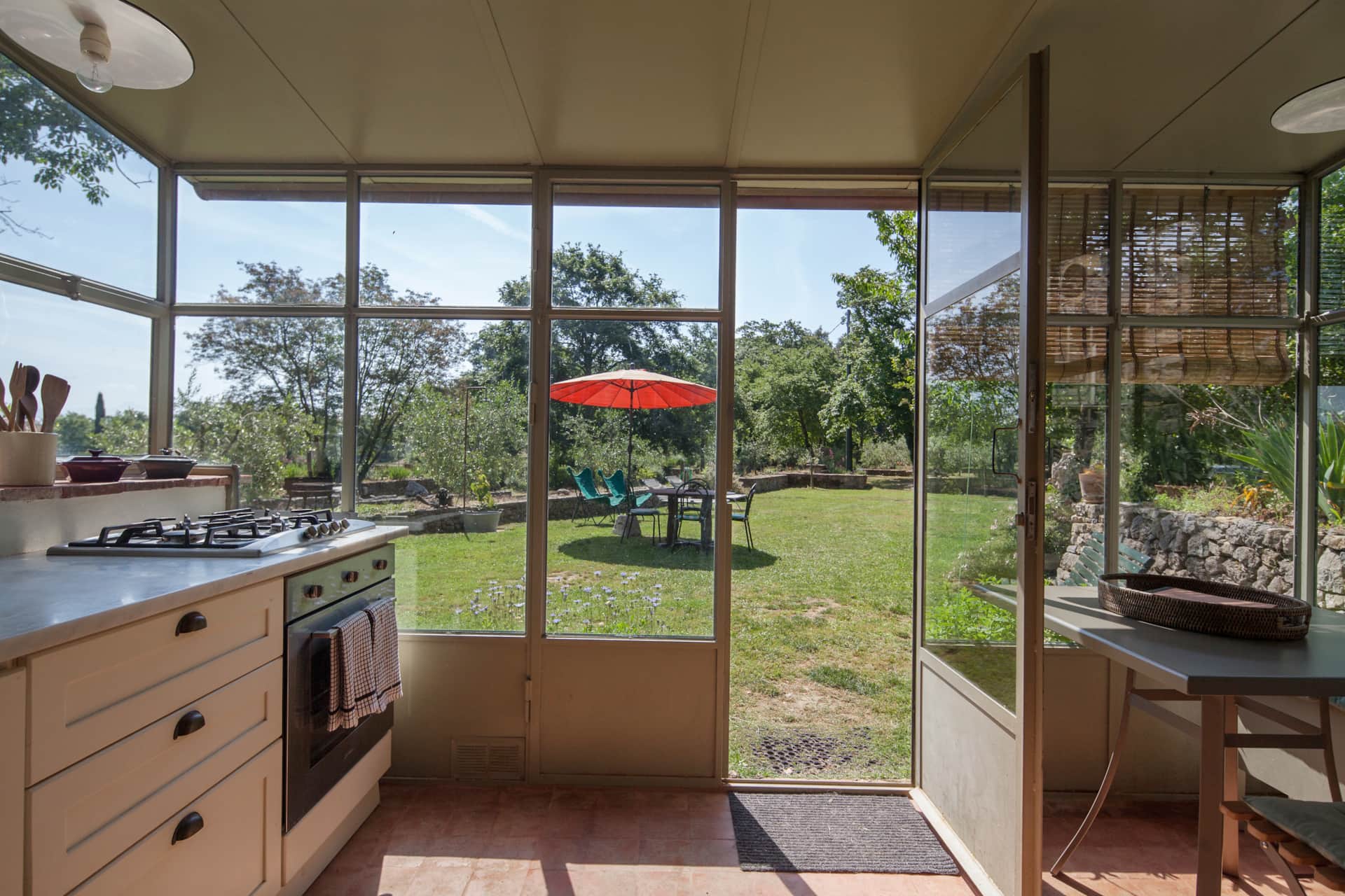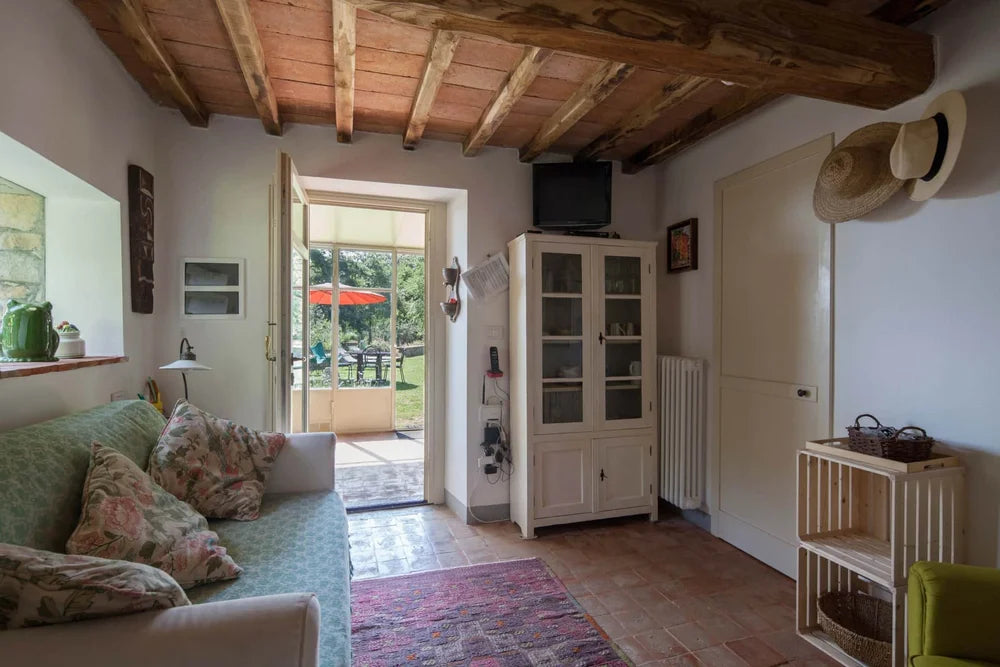 The living room is intimate and welcoming, with a small sofa that can be converted into a bed if needed. The kitchen, bathed in light and surrounded by greenery, is the perfect place to cook while enjoying views of the lawn, olive trees, and the vegetable garden.