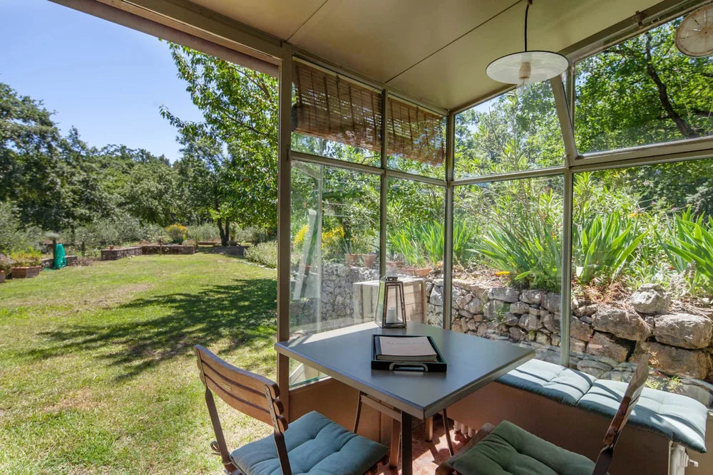 Spread over two floors, the house offers a quiet, sunlit bedroom upstairs.while the ground floor features a cosy living room with a wood-burning stove, a bathroom with a shower, and a kitchen set in a charming glass veranda overlooking the garden.