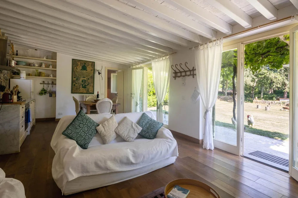 At the heart of the house is an open-plan space where the marble-topped kitchen blends with the lounge, furnished with two comfortable sofas. Large glass doors open onto the garden, creating a bright, airy space in continuity with the outdoors.
