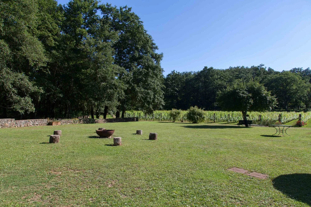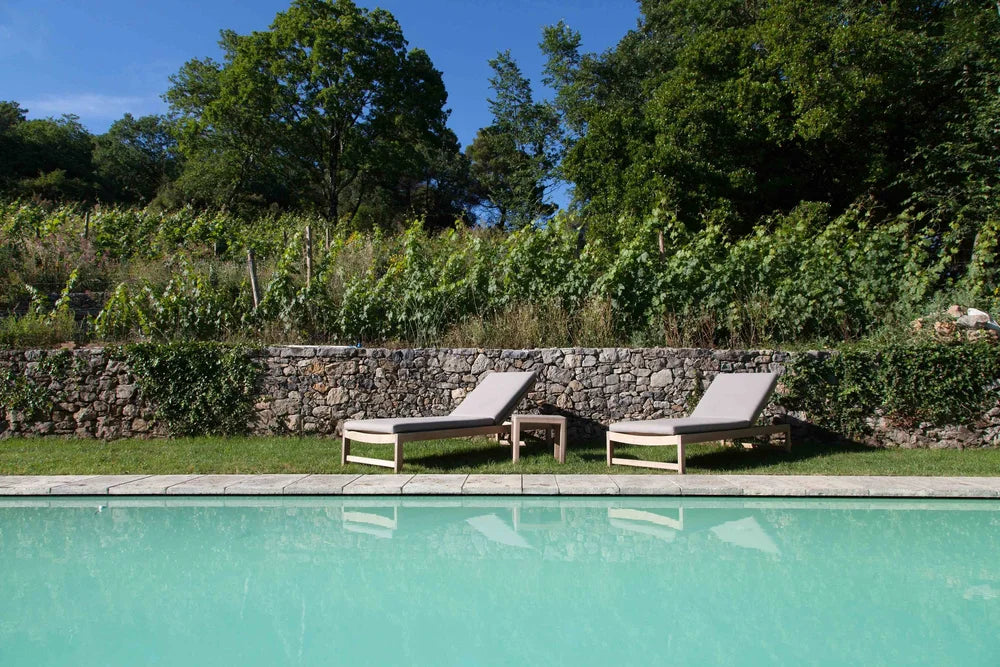 A short walk from the house takes you to the shared swimming pool, nestled among the Cabernet Franc terraces, with four sun loungers and a Balinese daybed shaded by wisteria.
