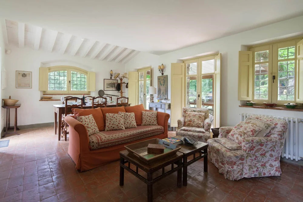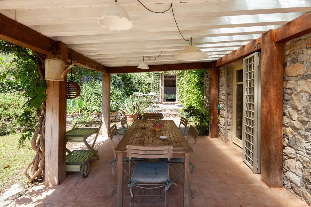 The pergola leads to an elegant living-dining room with terracotta floors, exposed chestnut beams, and an old fireplace at its center.