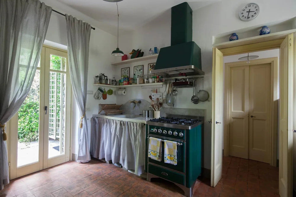 From the kitchen, featuring a marble countertop and antique furniture, you access a bathroom and a spacious double bedroom with high ceilings and garden views.